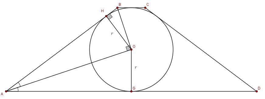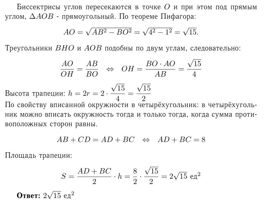 Равнобедренная трапеция ABCD с основаниями AD и BC описана около окружности с центром О.Найдите площадь трапеции,если AB=4,BO=1.