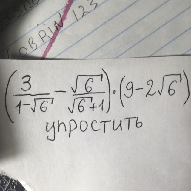 1)Сначала приводим к общему знаменателю первую скобку и тогда получится: (3 корень из 6+3-корень из 6+6)/(1-корень из 6)*(1+корень из 6)=(2корень из 6 + 9)/-5.