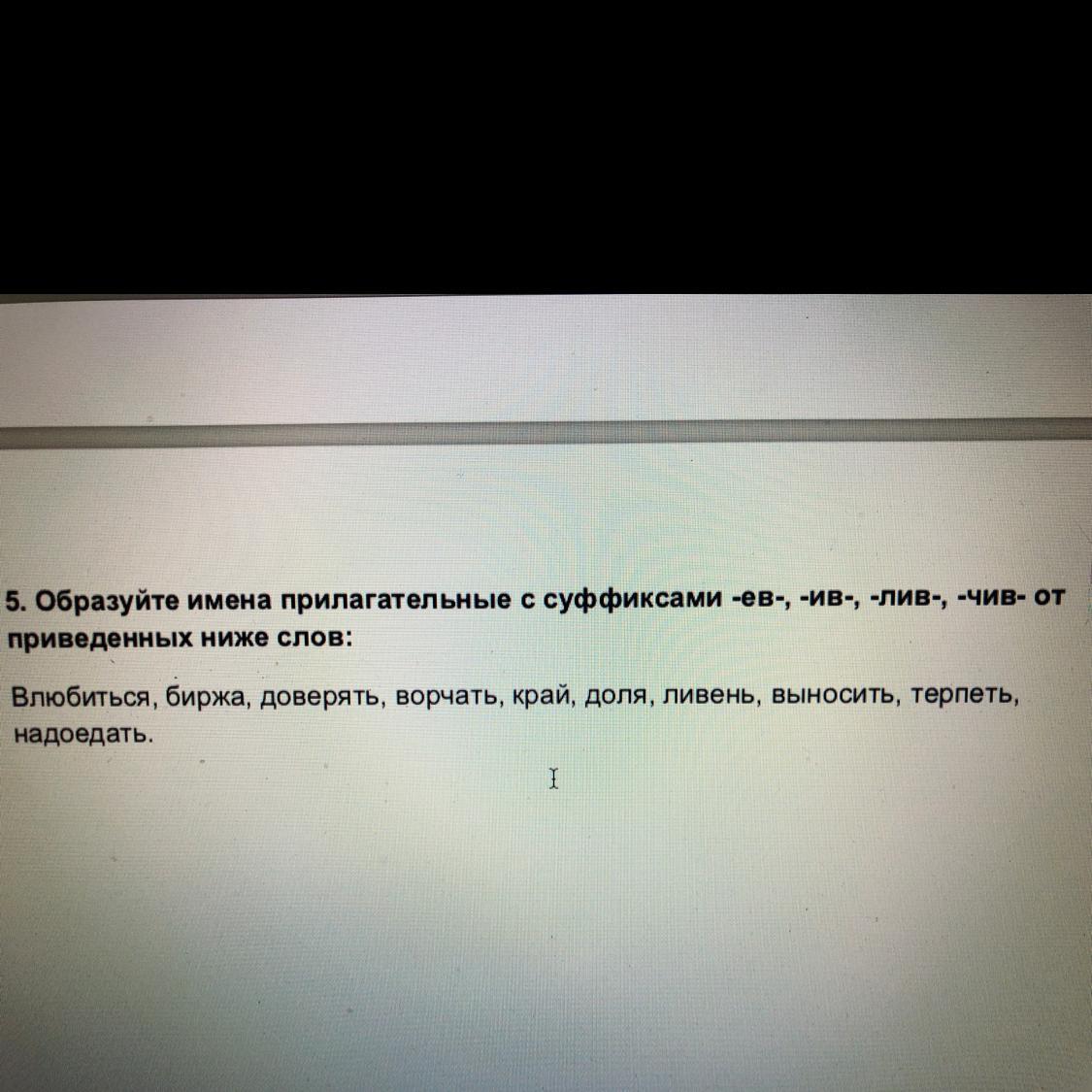 Ответ:влюбчивый, биржевой, доверчивый, ворчливый, ненавистный (не получилось с суффиксами), вечевой, краевой, долевой, ливневый, выносливый, терпеливый, надоедливый, плющевой, уступчивый.