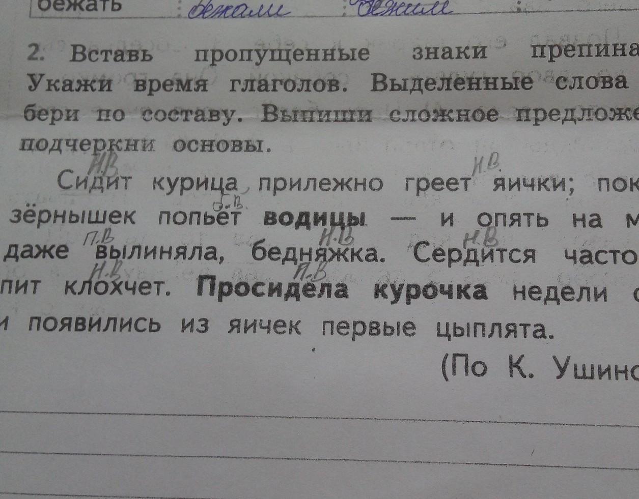 сидит курица прилежно(настоящее.время.),греет яички(настоящее время),поклюёт зёрнышек(будущее время),попьёт водицы(будущее время) и опять на место,даже вылиняла(прошедшее время),бедняжка,сердится часто(настоящее время),шипит(настоящее время),клохчет(настоящее время).Просидела курочка недели три(прошедшее время) и стало(прошедшее время) из яичек цыплята выклёвываться(будущее время