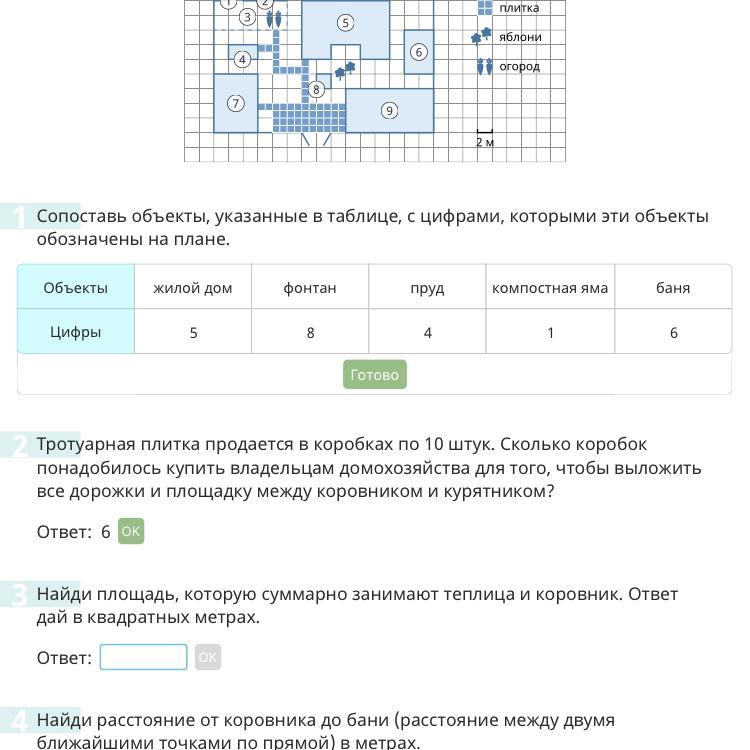 Найдите расстояние от бани до хозяйственных построек ( расстояние ПО прямой между ближайшими точками) в метрах. Баня это 4, постройки цифра 3