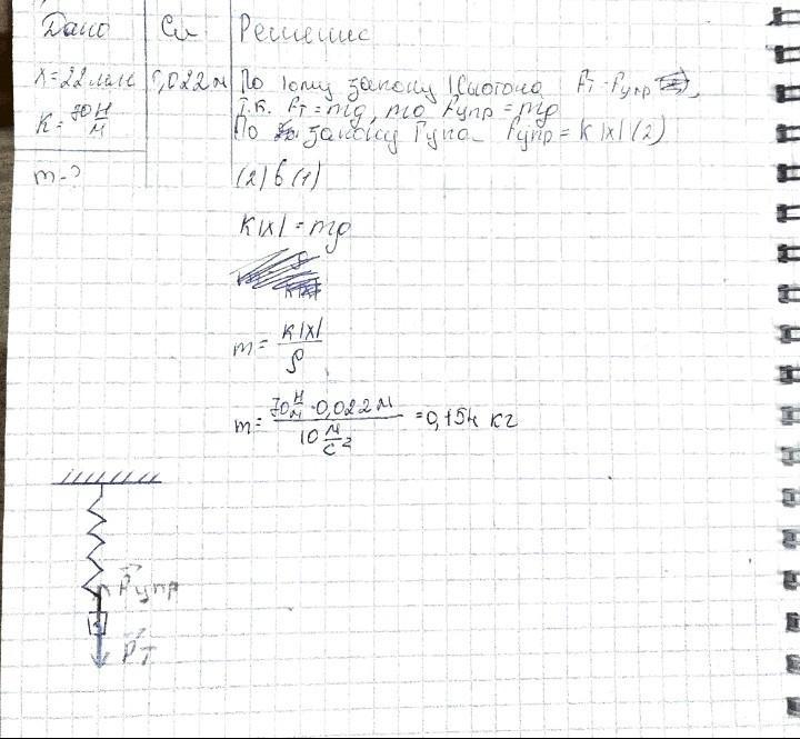 Под действием груза пружина растянулась на 20 мм. Жесткость пружины равна 70 Н/м. Чему равна масса груза?