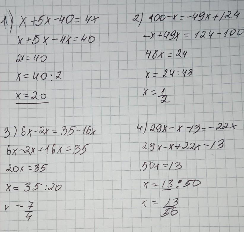 1) x=20 2) x=2 3) x=4/7 4) x= 13/50