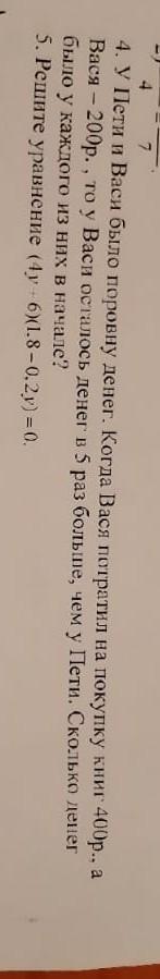 x-200 стало у Васи, а это по условию задачи в пять раза больше, можем составить уравнение: