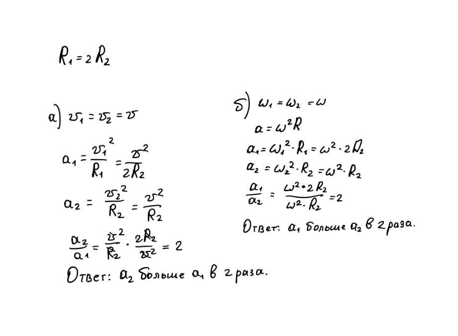 Две материальные точки движутся по окружности радиусами R1 и R2,, причем R1 = 2R2. Сравнить их центростремительные ускорения в случаях: а) равенства их линейных скоростей; б) равенства их угловых скоростей.