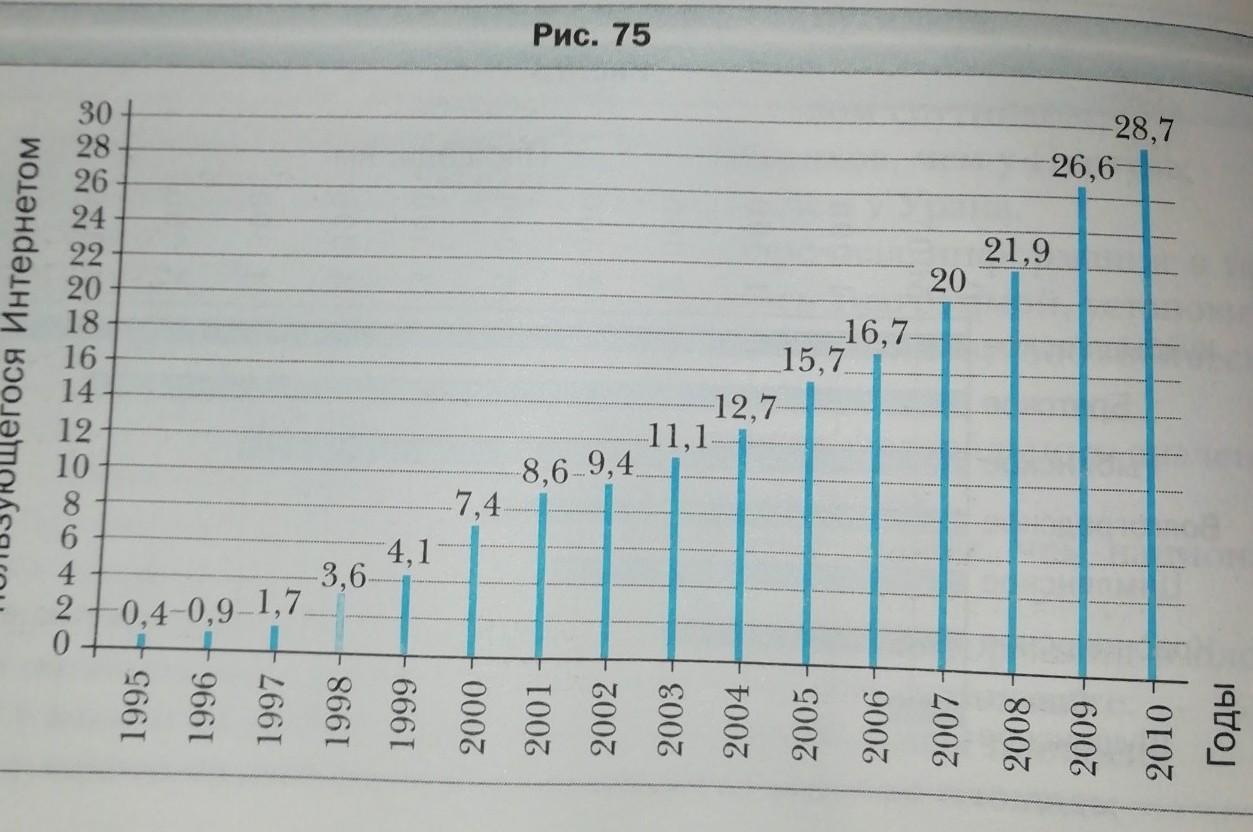 на рисунке 75 приведена диаграмма количества пользователей интернета в мире в процентах по отношению к общему количеству населения в 1995 года по 2010 год в течение каждого года произошёл наименьший прирост количества пользователей? наибольший прирост?