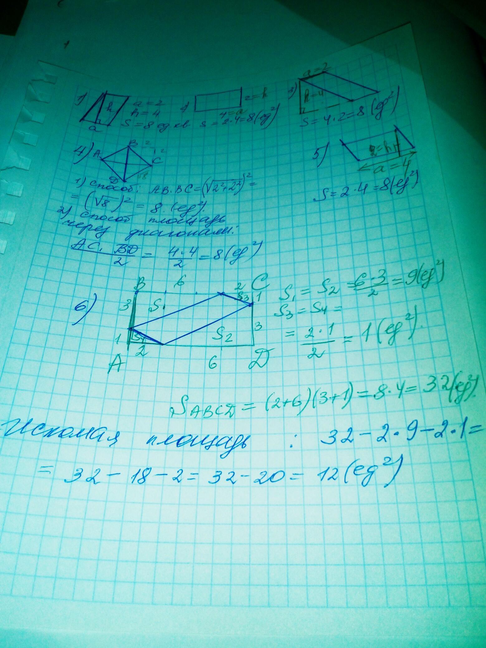 Левый нижний рис. квадрат, его площадь можно найти как половина произведения диагоналей, т.е. 4*4/2=8/ед. кв./, следующий параллелограмм, если за основание принять нижнюю сторону, то высота равна 2, основание 4, площадь 8 ед.кв. и наконец, последний рис., как и остальные, найдете во вложении.