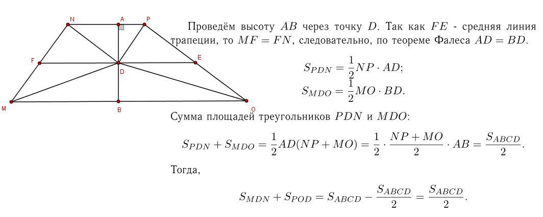На средней линии трапеции MNPO с основаниями NP и MO выбрали произвольную точку D. Докажите, что сумма площадей треугольников MDN и POD равна половине площади трапеции.