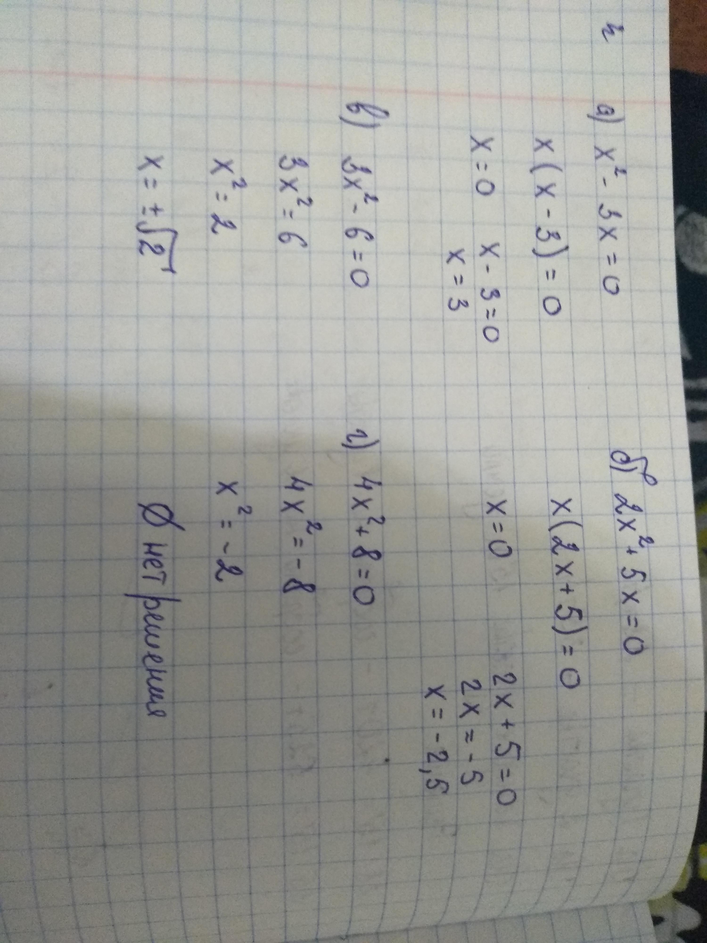 Решите неполные квадратные уравнения:а)х^2-3x=0, б)2х^2+5x=0, в)3х^2-6=0, г)4х^2+8=0.Пожалуйста помогите очень прошу!!!:(((