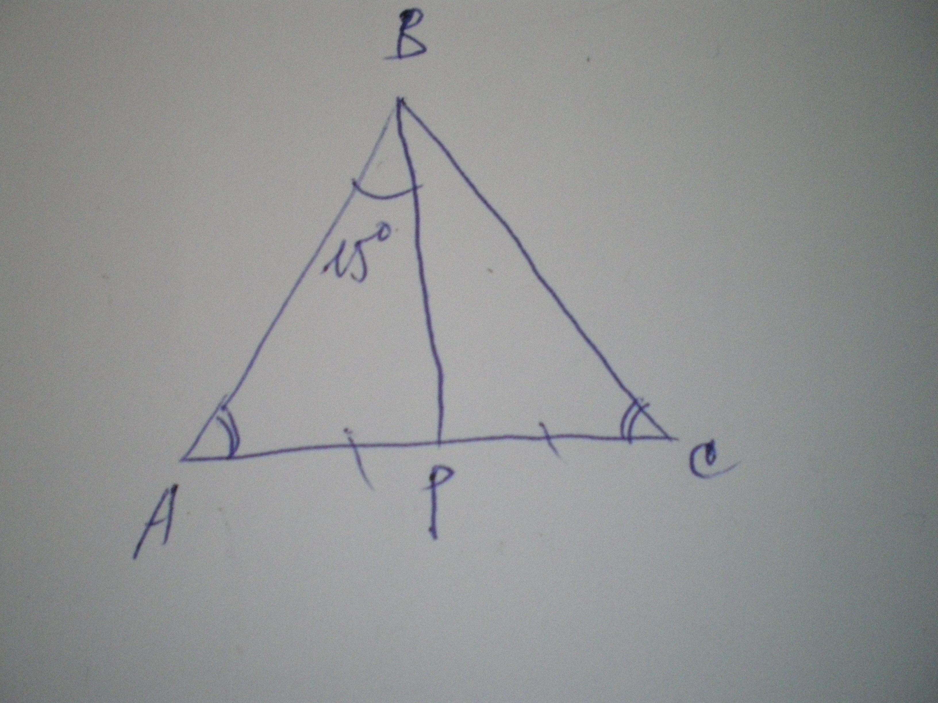 Знайдіть кути рівнобедреного трикутника АВС (АВ=ВС) якщо його медіана ВР утворює зі стороною АВ кут градусної міри 15° . Помогите решить пожалуста