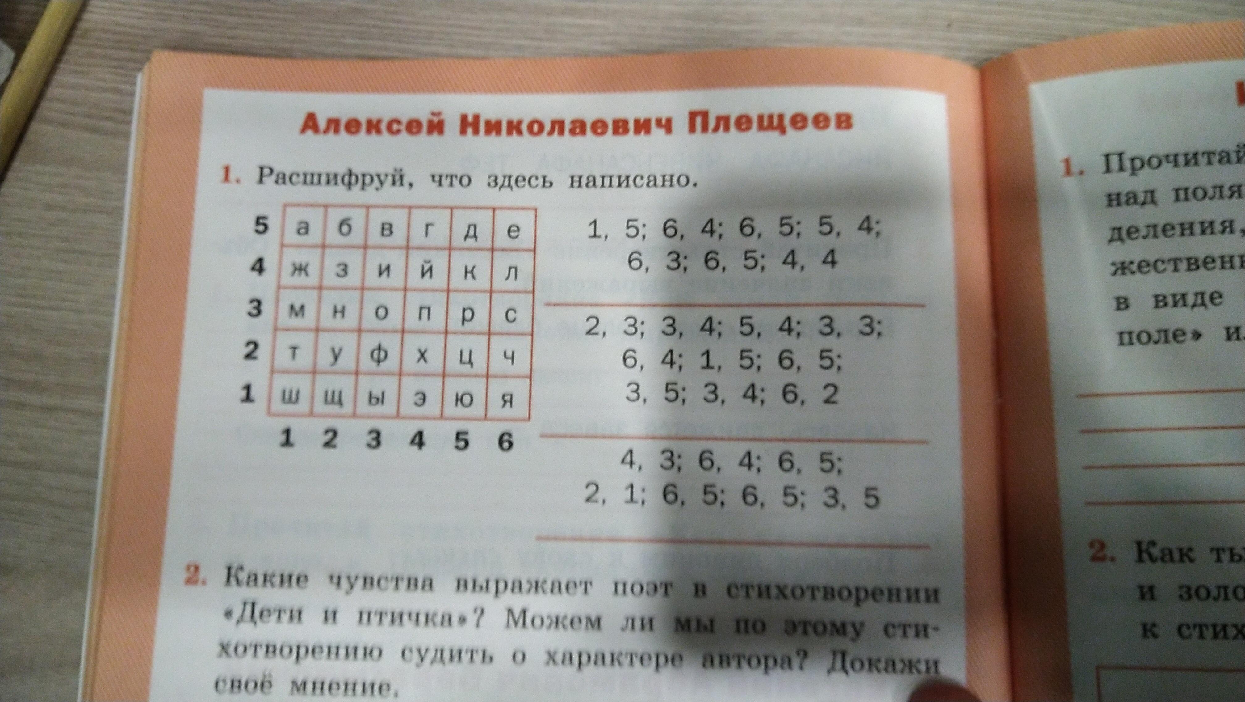 каждая буква состоит из 2 цифр, буквы отделены друг от друга знаком ";", первая цифра-горизонталь, вторая-вертикаль, получаем, что на пересечении их будет буква.