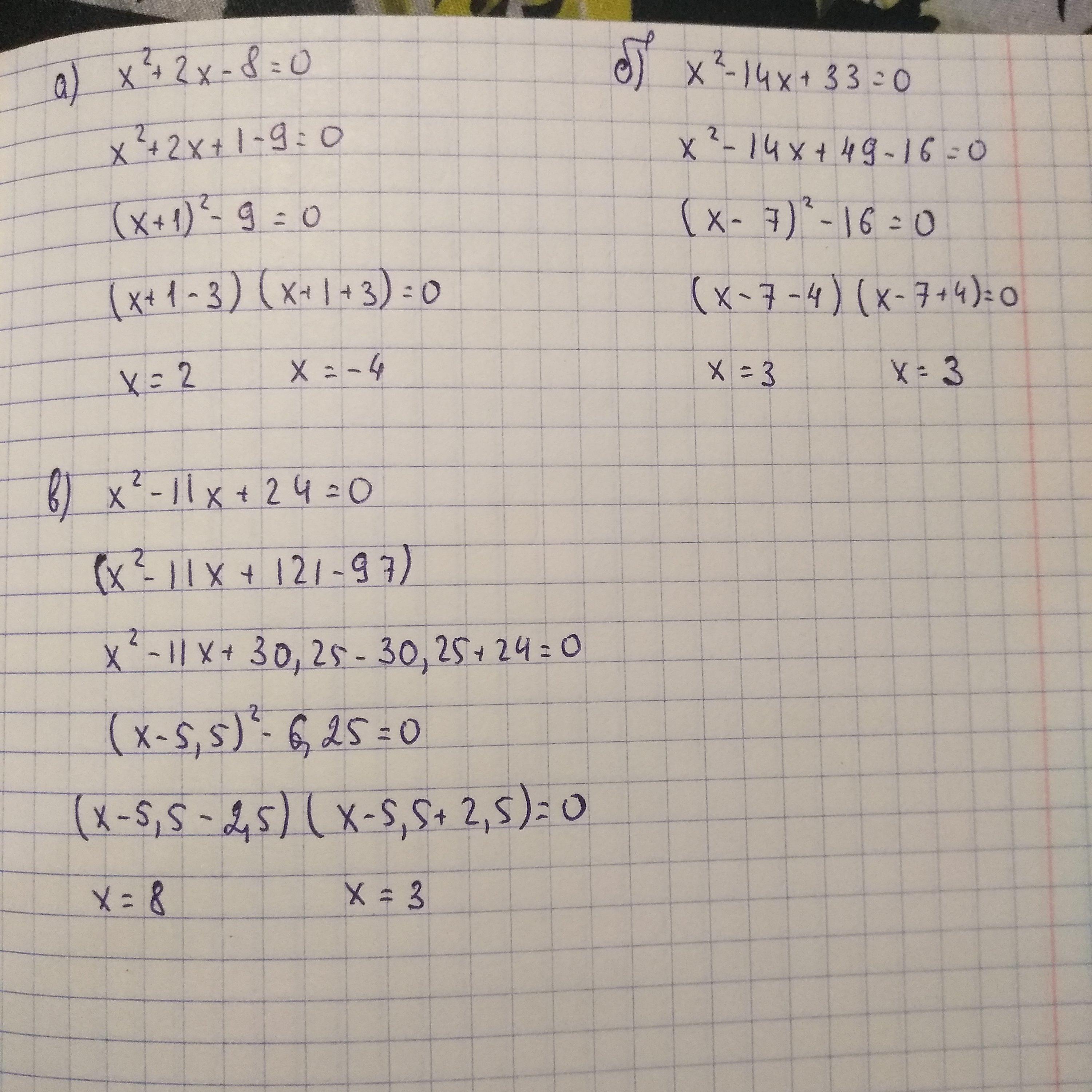 в)x^2-11x+24=0, x^2-11x+30,25-30,25+24=0,(х-5,5)²-6,25=0, (х-5,5)²=6,25; х-5,5=±√6,25; х-5,5=±2,5; х=5,5±2,5; х1=5,5-2,5=3;х2=5,5+2,5=8; х1=3; х2=8;
