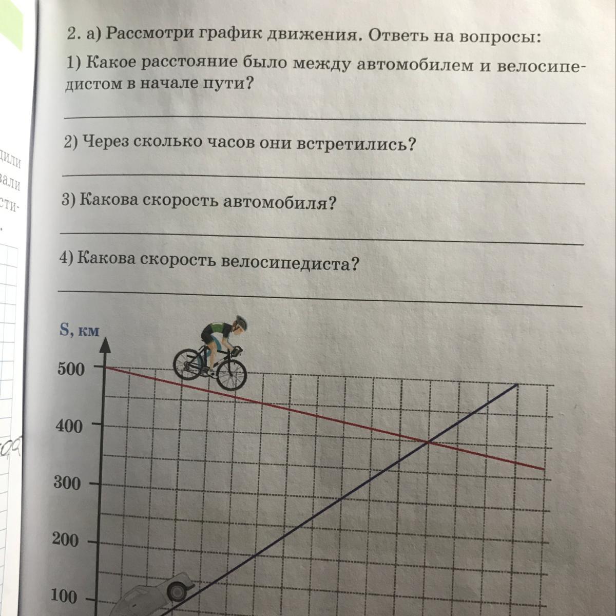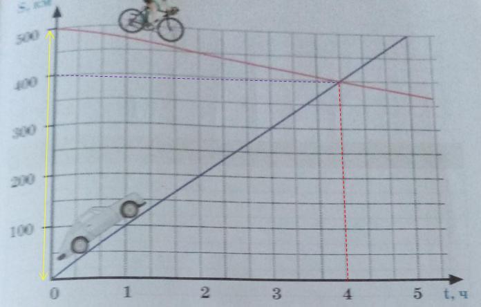 Они встретились в отметке 400 км (указывает лиловая линия). Тогда автомобиль проехал S₁=400 км, а велосипедист S₂=500-400=100 км.