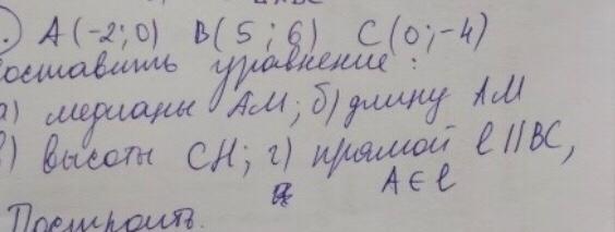 Уравнение медианы АM найдем, используя формулу для уравнения прямой, проходящей через две заданные точки. Медиана АМ проходит через точки А(-2; 0) и М(2,5; 1), поэтому: