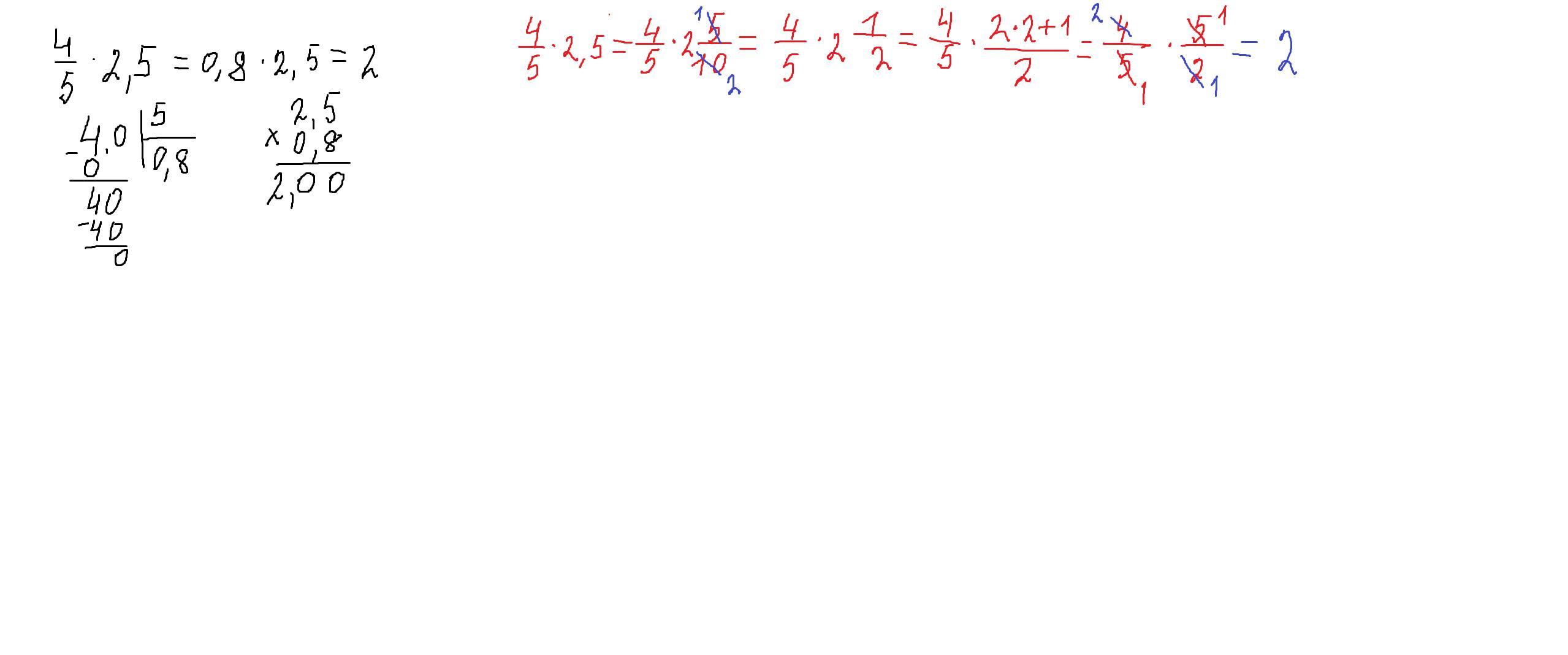 4/5*2,5.помогите решить распишите пожалуйста на листе. Как решали? Почему 4/5 это 0,8? И почему 2,5 это 2 1/2? И почему 0,8*2,5 получается 2? Хотя если считать в столбик то 200 у меня получилось