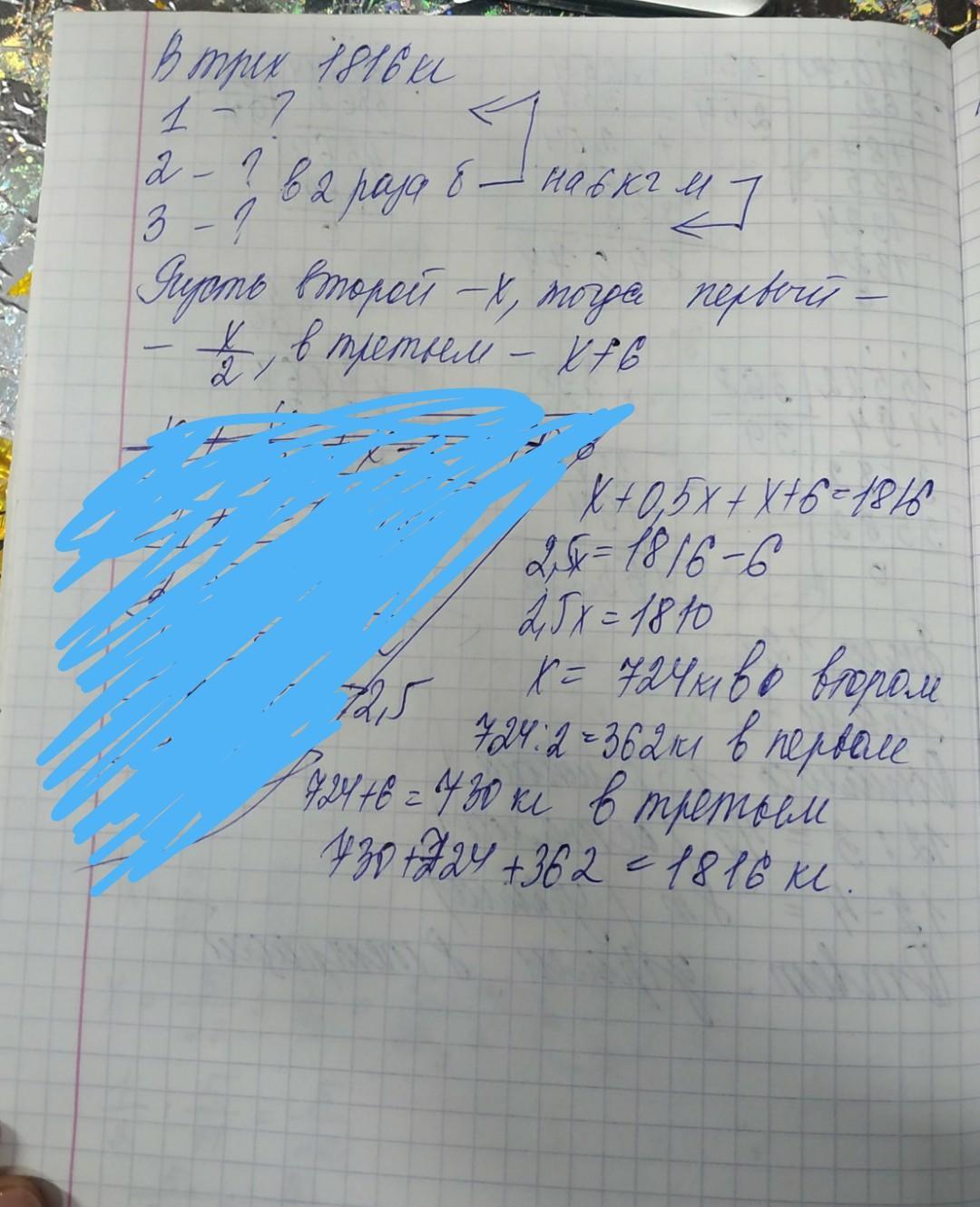 в 3 ящиках 1816 кг киви зная что во втором ящике в 2 раза больше чем в первом и на 6 кг меньше чем в третьем узнай сколько килограммов киви в каждом ящике