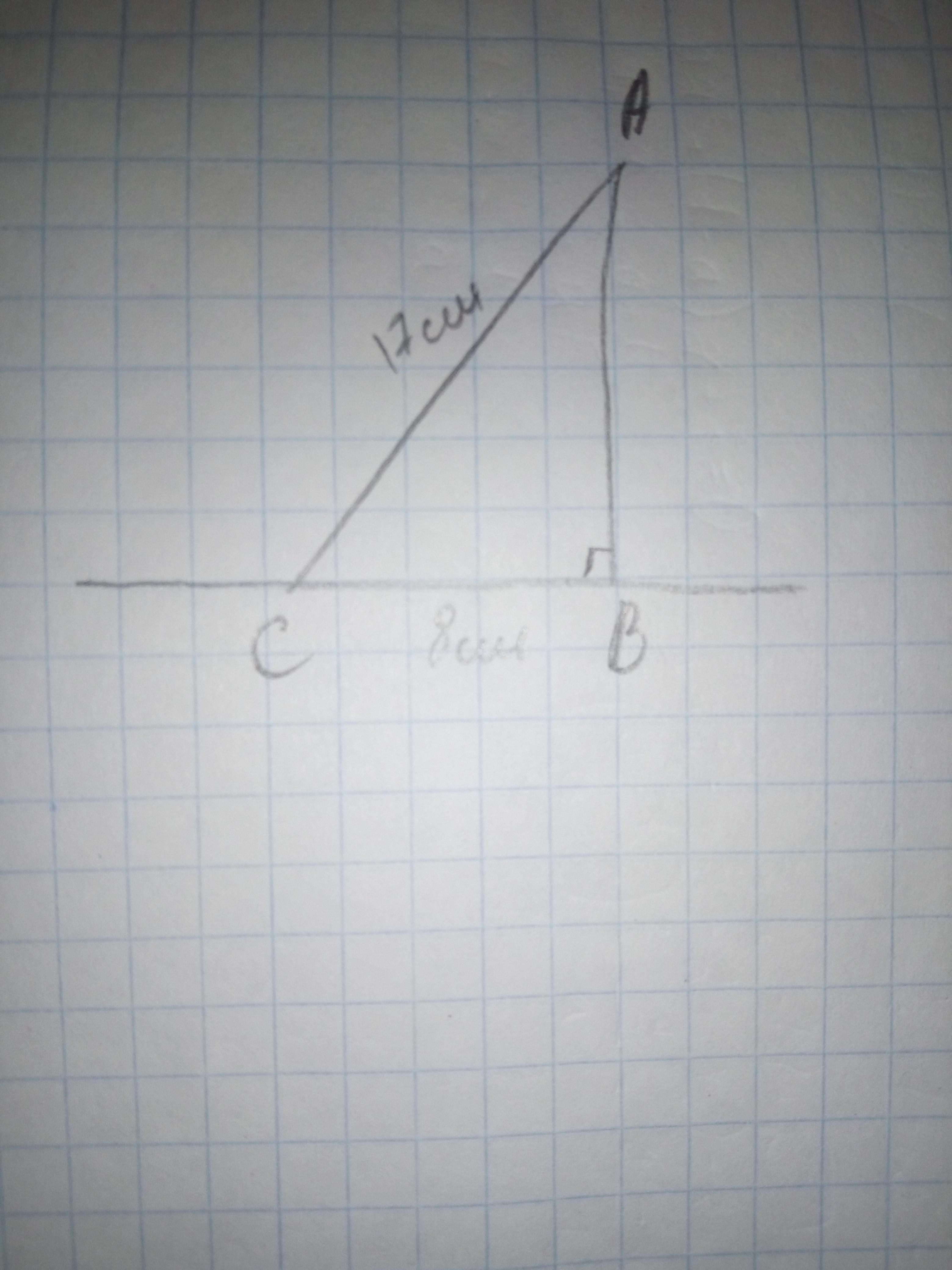 з точки A до прямої проведено перпендикуляр AB і похилу AC. знайти перпендикуляр AB, якщо похила AC дорівнює 17 см, а її проекція BC 8 см
