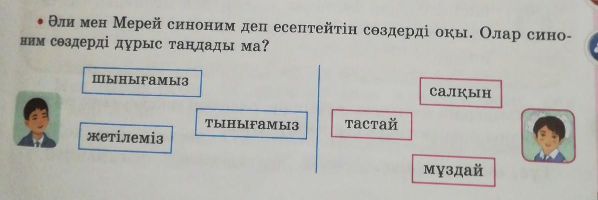 Әли мен Мерей синоним деп есептейтін сөздерді оқы. Олар синоним сөздерді дұрыс таңдады ма?