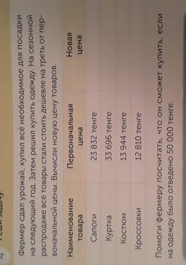 Чтобы купить всё, фермеру не хватает 56 188-50 000 = 6 188 тенге. Значит ему придётся отказаться от какого-либо одного предмета одежды. Можно отказаться от кроссовок, т.к. обувь (сапоги) у него будут.