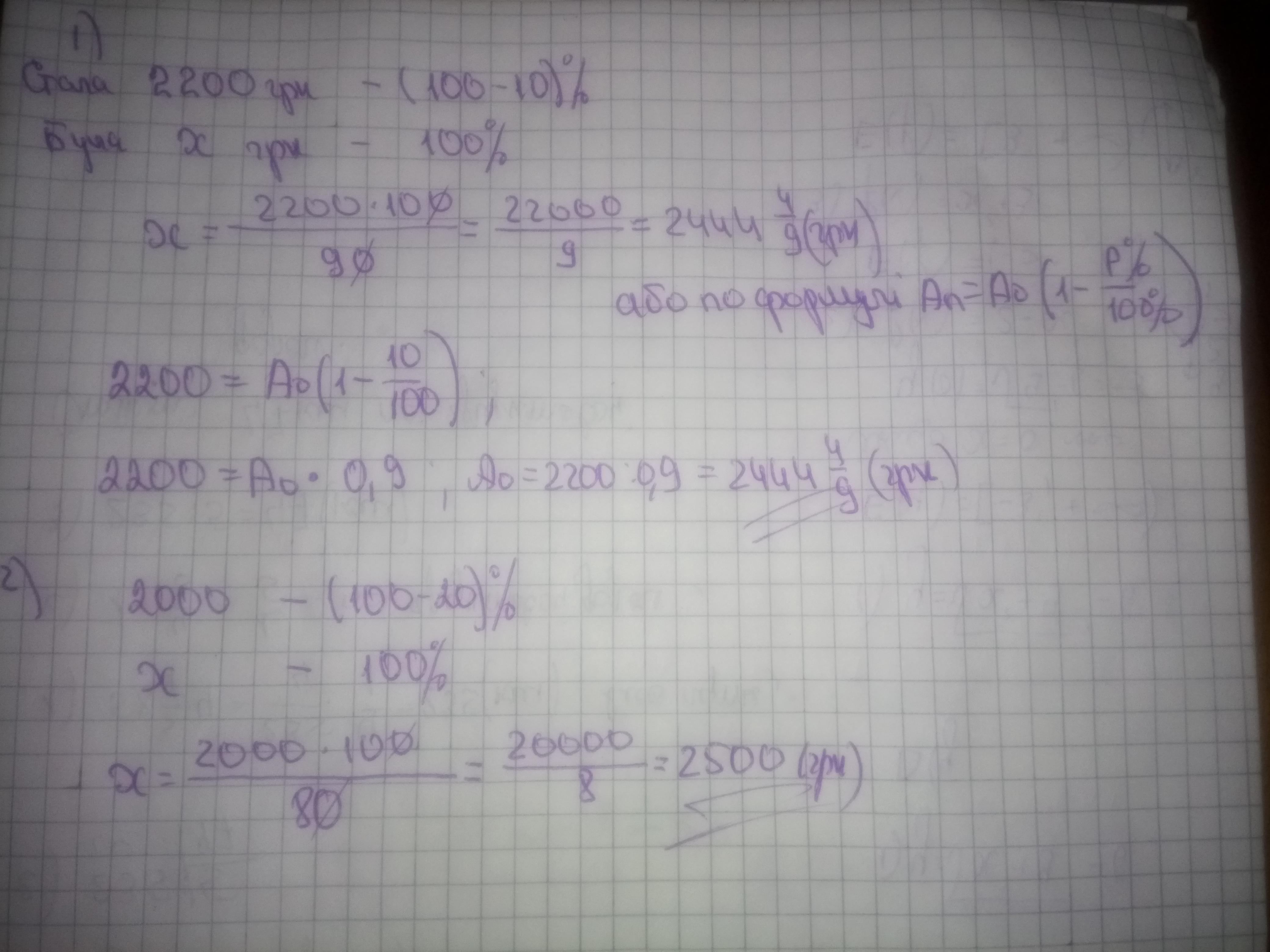 2)Матеріал подешевшав на 20% попередньої ціни, а нині коштує 2000грн.Яка була його попередня ціна?