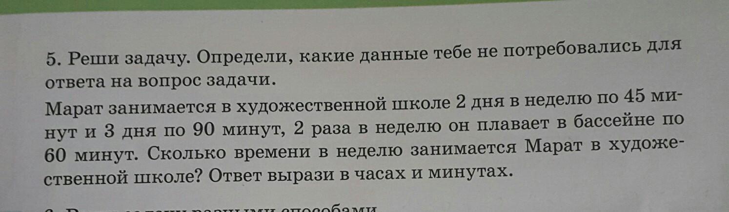6 часов Марат занимается в художественной школе. Для ответа не требуются данные о занятиях в бассейне.