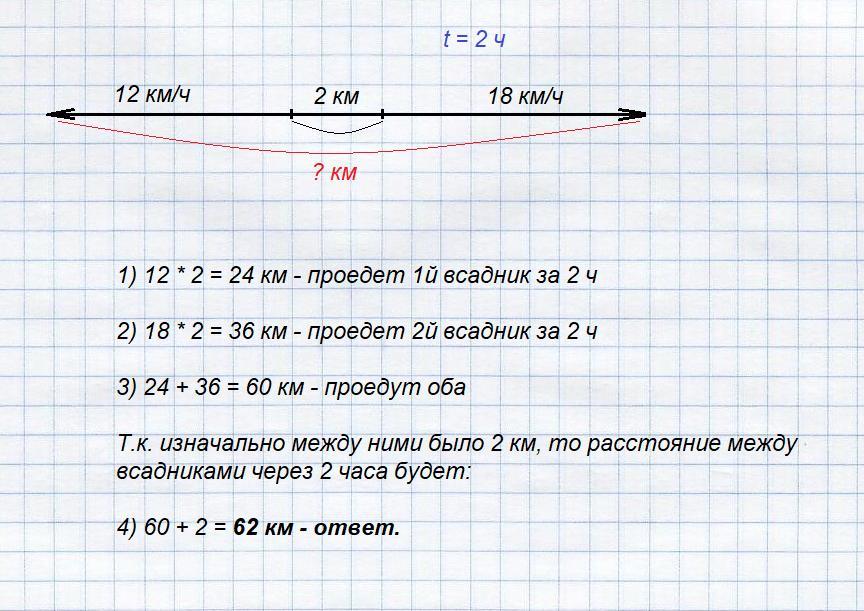 Из двух посёлков, расстояние между которыми 2 км, одновременно в противоположных направлениях выехали два всадника Скорость одного - 12 км/ч, а другого - 18 км/ч. Какое