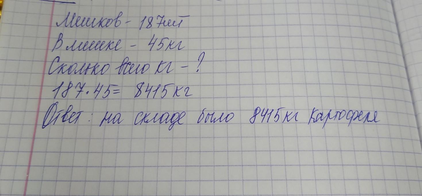 на складе картофель разложили в мешки по 45 кг в каждый сколько кг картофеля было на складе если весь картофель разложили в 187 мешков. здравствуйте помогите с решением