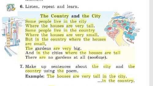 Make up sentences about the city and the country using the poem. Example: The houses are very tall in the city. ... in the country. помогите пожалуйста по три предложения