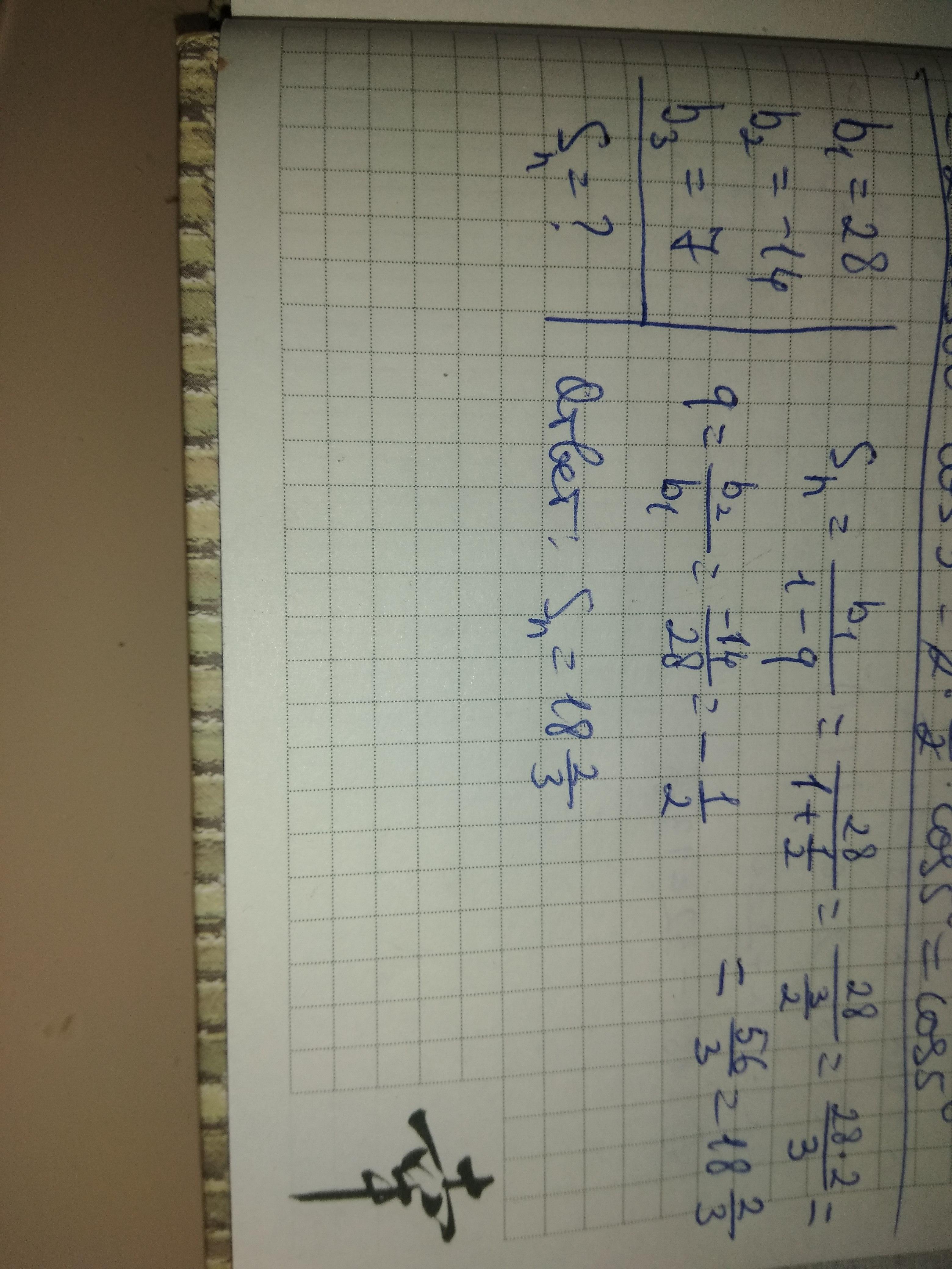 |q|=|-1/2|=1/2<1—› значит, эта прогрессия бесконечная и S∞=b1/(1-q)=28/(1-(-1/2))=