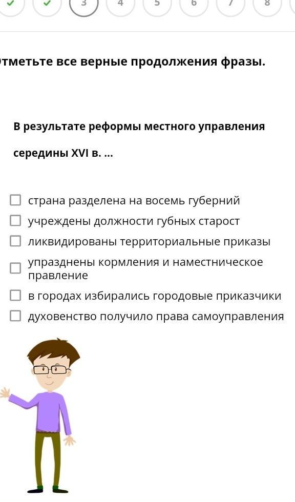 В результате реформы местного управления середины 16 в. ... 1)страна разделега на 8 губерний 2)учреждены должности губных старост 3) ликвидированы территориальные приказы 4)упразднены кормления и наместническое правление 5)в городах избирались городовые приказчики 6)духовенство получило права самоуправления
