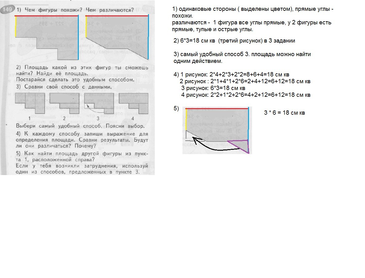 3. Сравни свой способ с данными. Теперь даны четыри фигуры (тож почти прямоугольники, на одном показано стрелочкой что часть нужно переместить) Выбери самый удобный способ. Пояни свойвыбор.