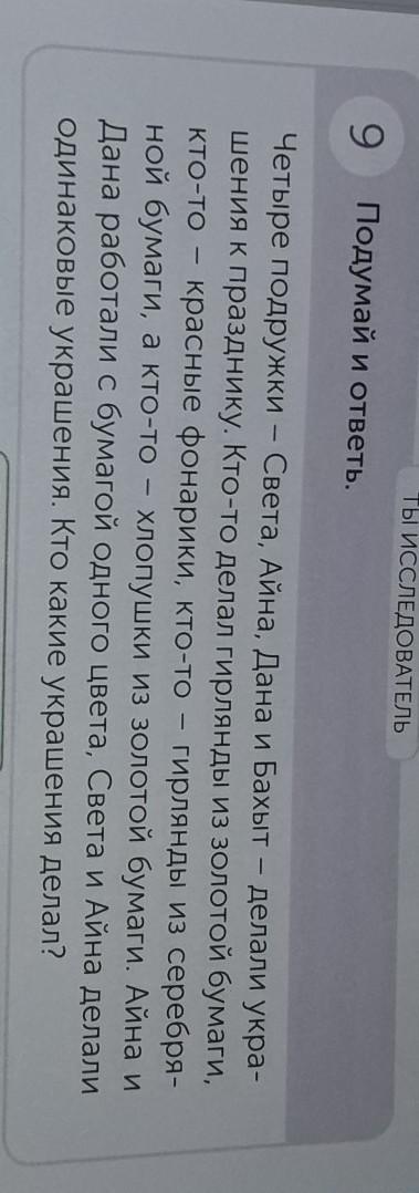 Так как Айна и Дана работали с бумагой одного цвета, то они делали гирлянды и хлопушки из золотой бумаги. Света и Айна делали одинаковые украшения, то есть, гирлянды из золотой бумаги, либо гирлянды из серебрянной. В данном случае, Айна должна делать гирлянды из золотой бумаги, так как Айна есть и в первом и во втором условии, так же, как и гирлянды из золотой бумаги. Значит, Дана делала хлопушки из золотой бумаги, Света делала гирлянды из серебрянной бумаги, а Бахыт - красные фонарики.