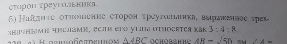 Найдите соотношение сторон треугольника выраженное трёхзначными числами если его углы относятся как 3:4:8