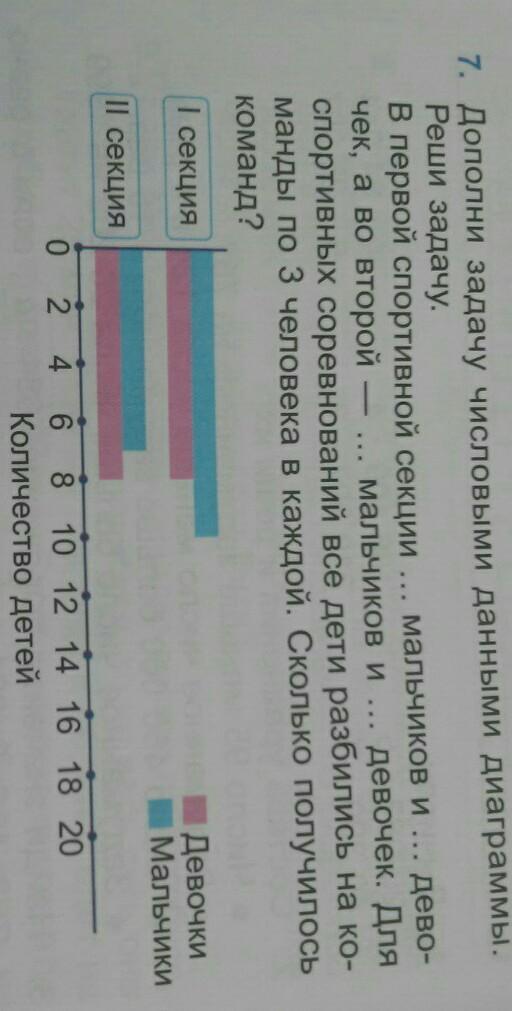 Во второй секции 7 мальчиков, т.к. единичный отрезок здесь 2, т.е. между 6 и 8 есть 7, как раз голубая линия доходит до этого места, число девочек - 8.