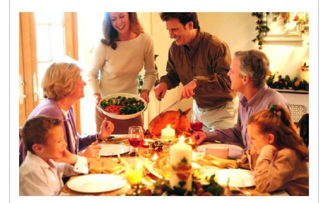 In the picture, an American family celebrates New Year with their family. the family is very happy. There is a New Year's big table. I also see how the father of the family is going to cut the chicken. and mother is going to impose a family salad.