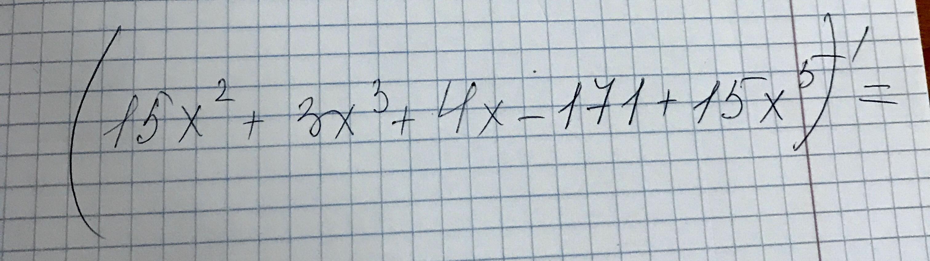 (15·x²+3·x³+4·x-171+15·x⁵)'=15·(x²)'+3·(x³)'+4·(x)'-(171)'+15·(x⁵)'=