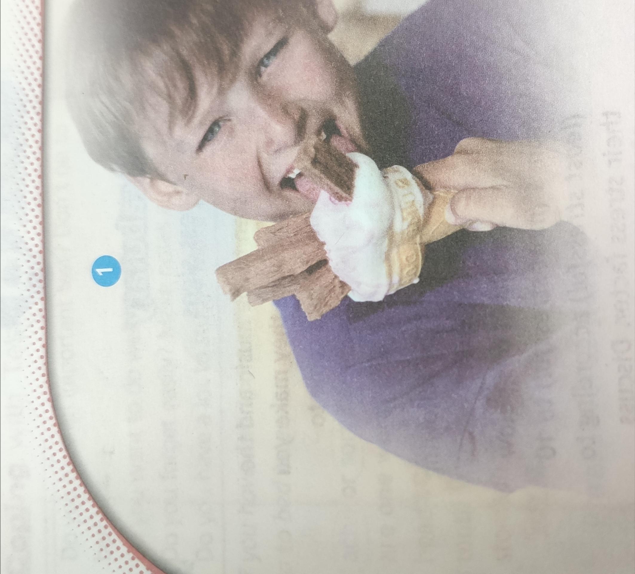 I can see a boy in the picture. He is wearing a blue sweater. He is eating an ice-cream. I think it is a vanilla ice-cream because it is white. There are several large pieces of chocolate in the ice-cream. The boy is happy. He is enjoying eating that ice-cream because it is tasty and sweet. I would also like some ice-cream.