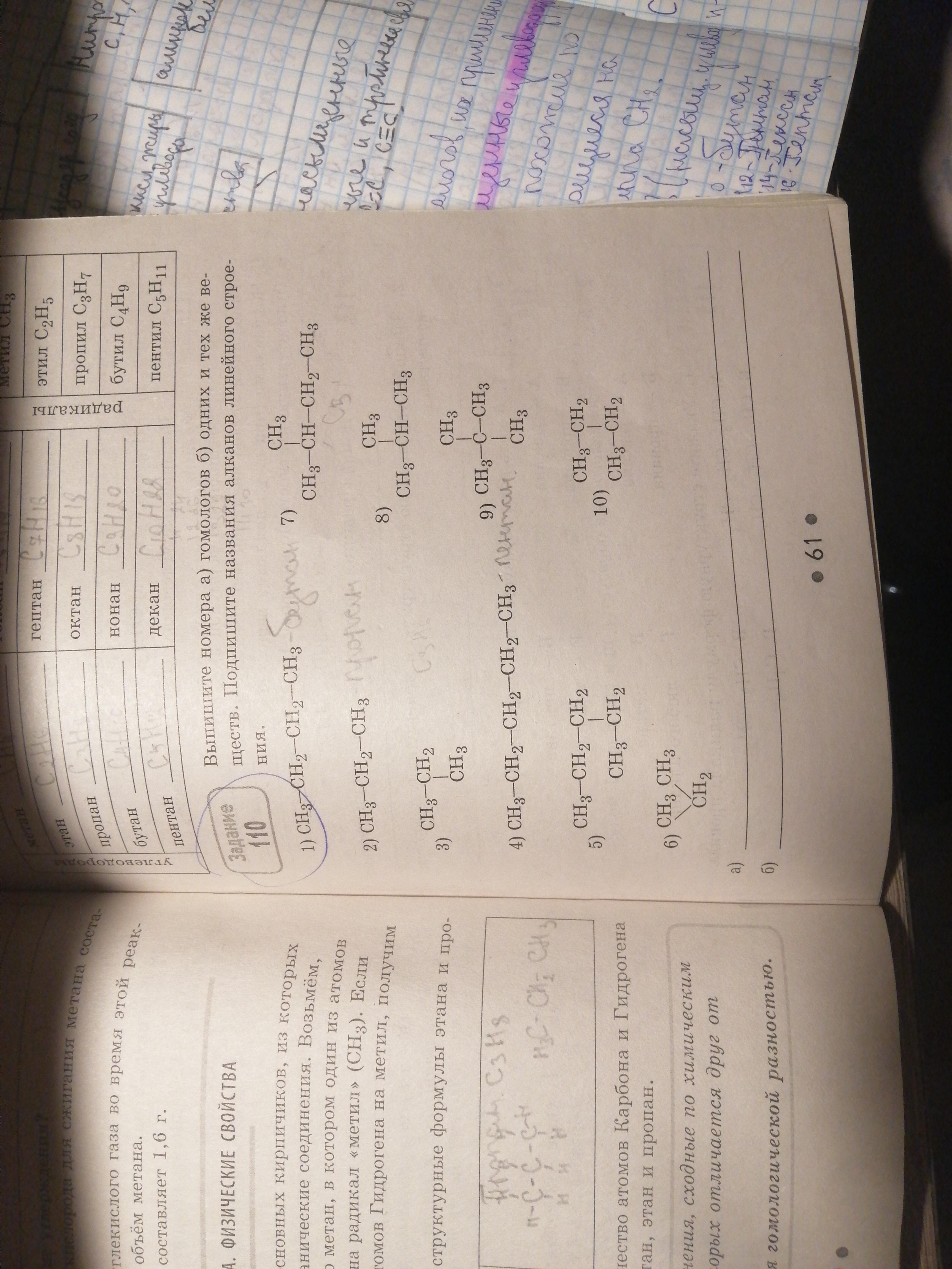Выпишите номера а гомологов в одних и тех же веществ подпишите названия алканов линейного строения.