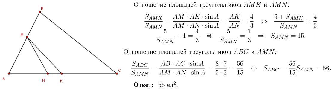 что AN:NK:KC=3:1:4. Найдите площадь треугольника ABC, если площадь треугольника MNK равна 5.