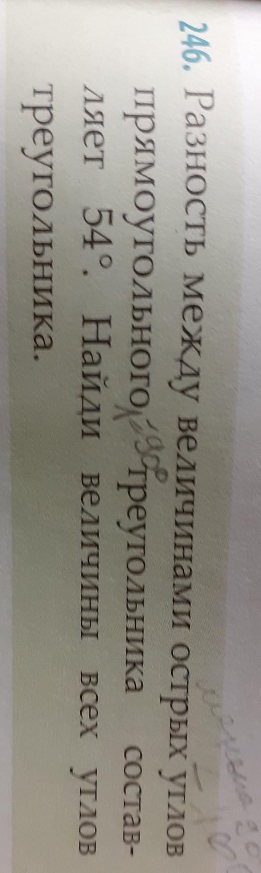 только уравнением,приняв меньший угол за Х,тогда второй Х+54,а сумма 90(потому что 180-90=90(сумма внутренних углов -180,прямой-90))