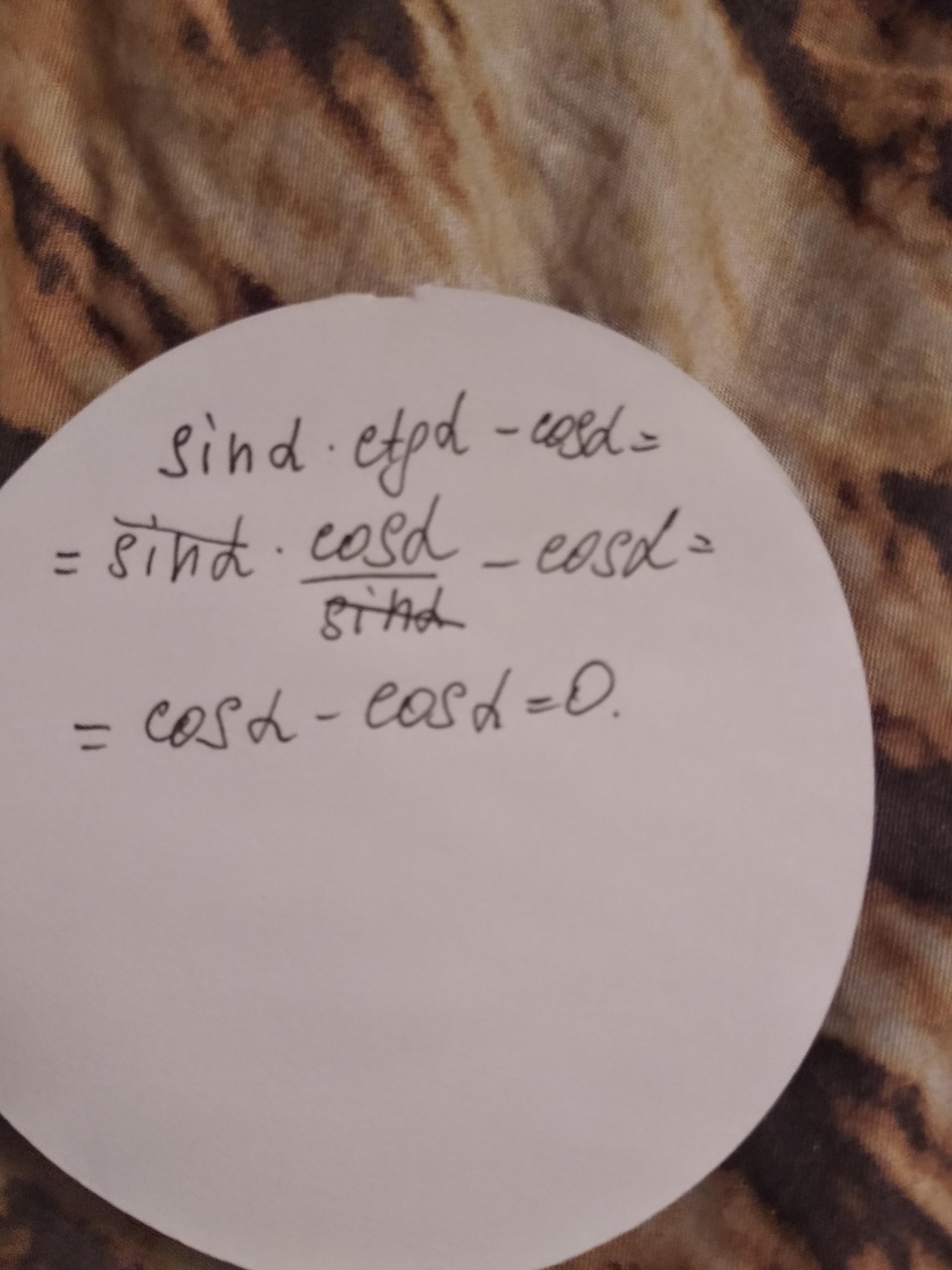 sin(a)*ctg(a)-cos(a)= sin(a)* cos(a)/sin(a) -cos(a)=cos(a)-cos(a)=0