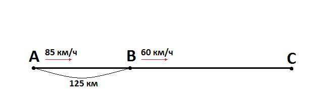 Составь чертёж. Реши задачу .Города A , B и C соединены шоссе, город В расположен между городами A и C. Из города А в город С выехал автомобиль со скоростью 85 км /ч , и одновременно с ним из города B в город С выехал грузовик со скоростью 60 км/ ч.Через сколько часов автомобиль догонит грузовик, если расстояние между городами А и Б равно 125 км?