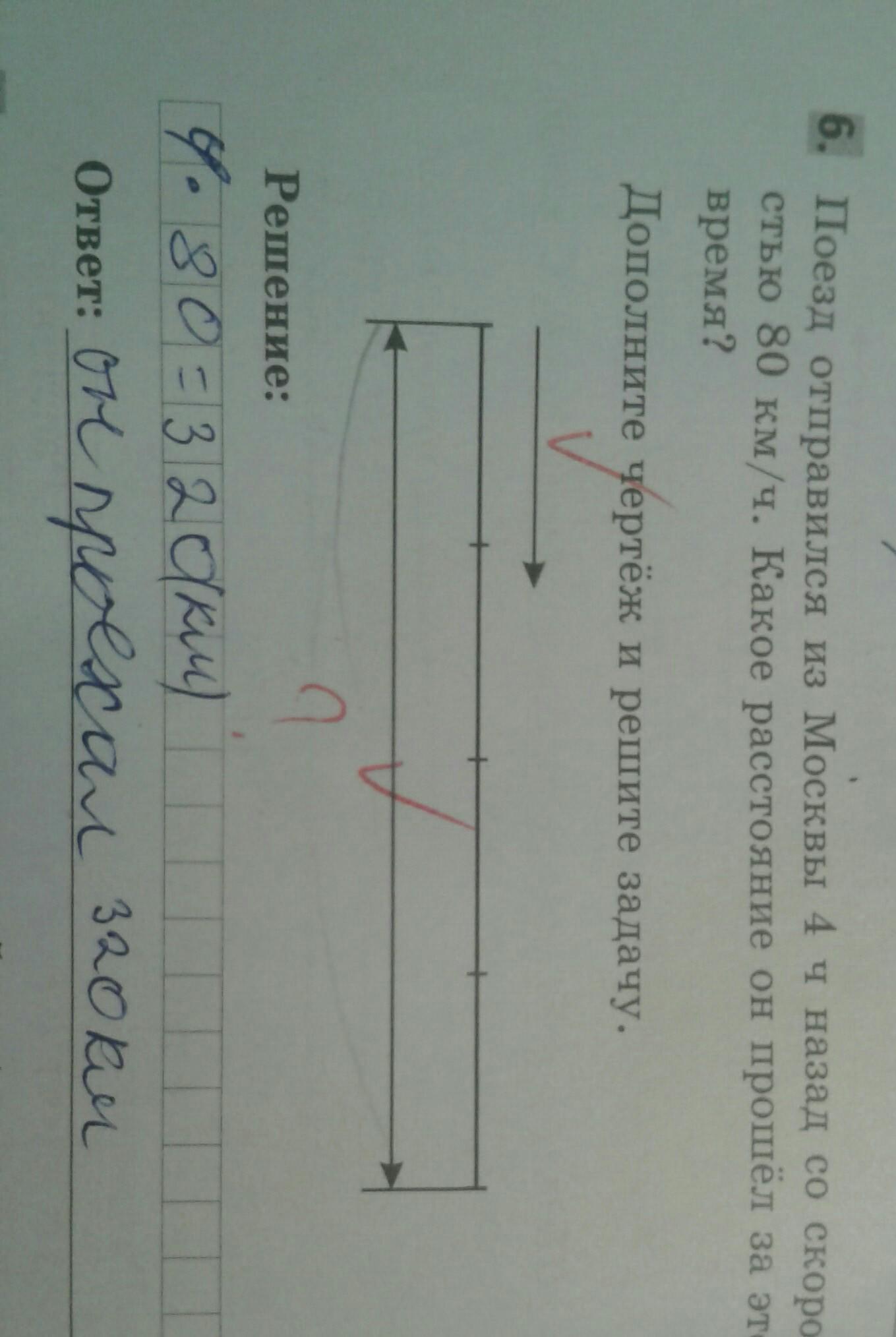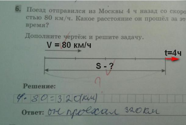 Поезд отправился из Москвы 4 часа назад со скоростью 80км/час. Какое расстояние он прошел за это время? Дополните чертеж и решите задачу.
