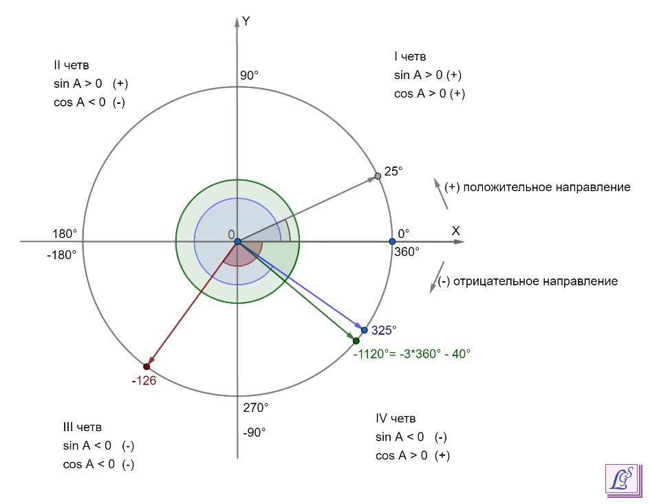 какой знак имеет значение sin A и cos A если угол А равен 25 градусов минус 126 градусов 325 градусов минус 1120 градусов.