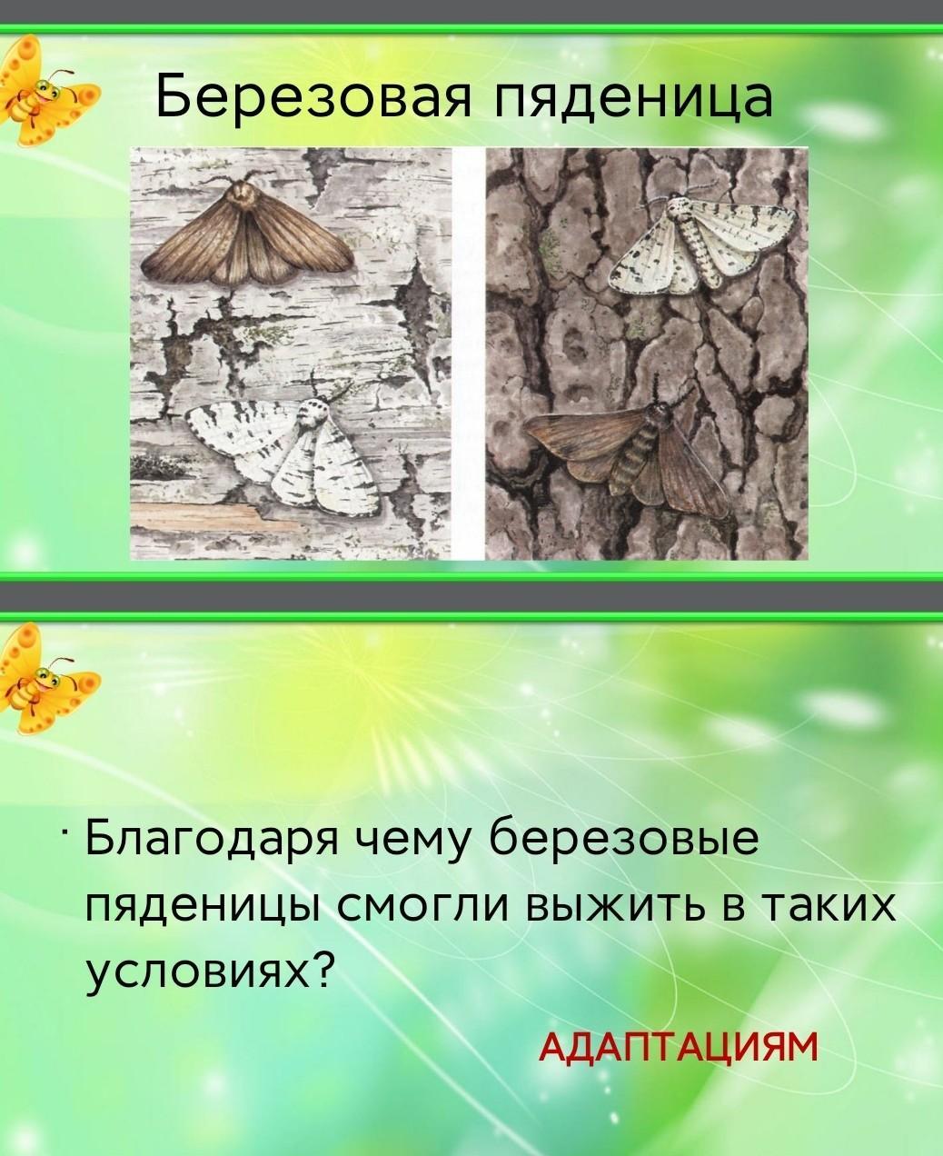 На бледном фоне березовых стволов она мало приметна и потому лучше защищена от хищников. В районах с сильным загрязнением воздуха стволы деревьев приобретают темносерый оттенок и тогда светлая бабочка становится легкой добычей птиц. В такой ситуации темная форма бабочки имеет больше шансов выжить и широко распространиться