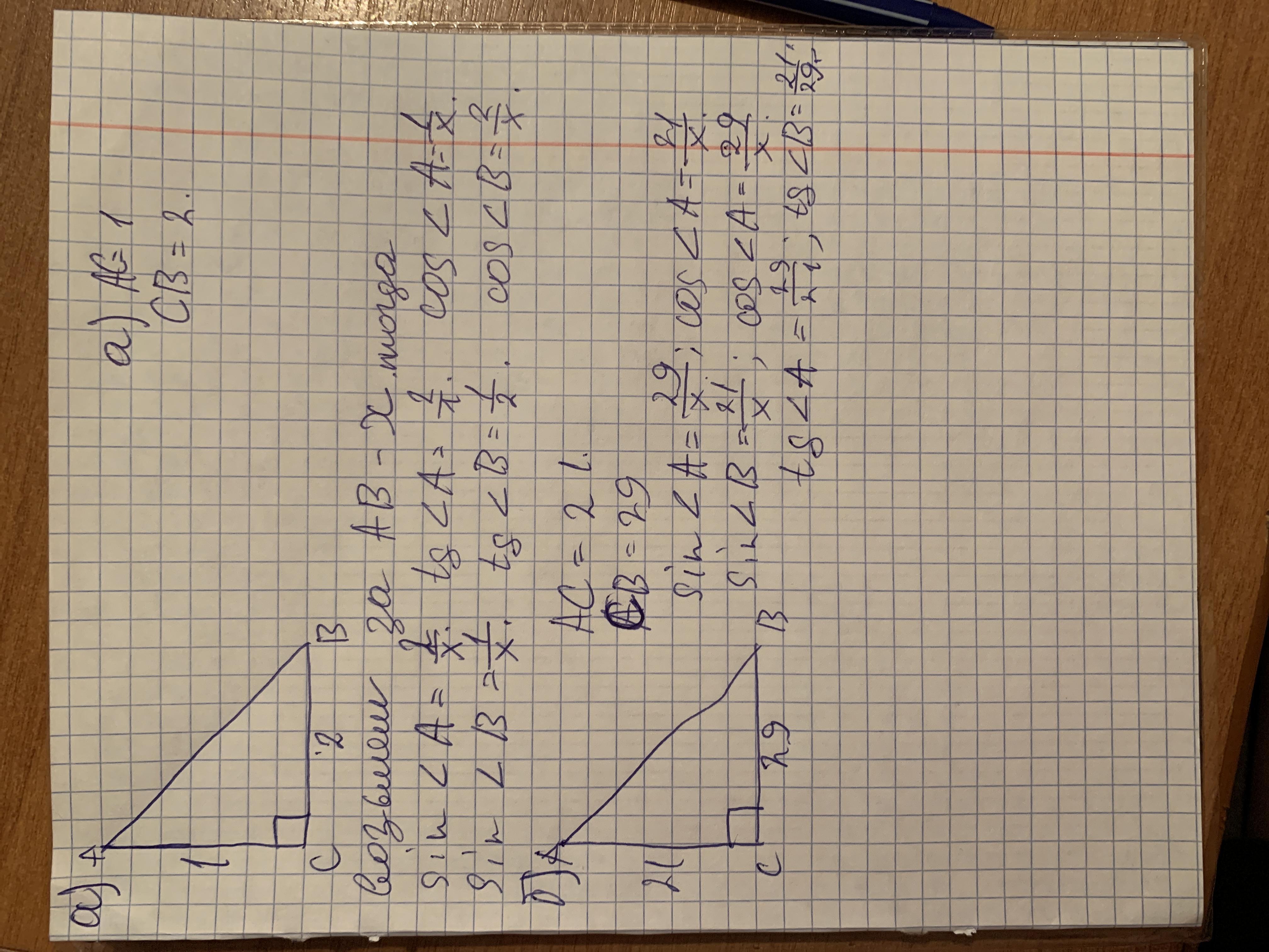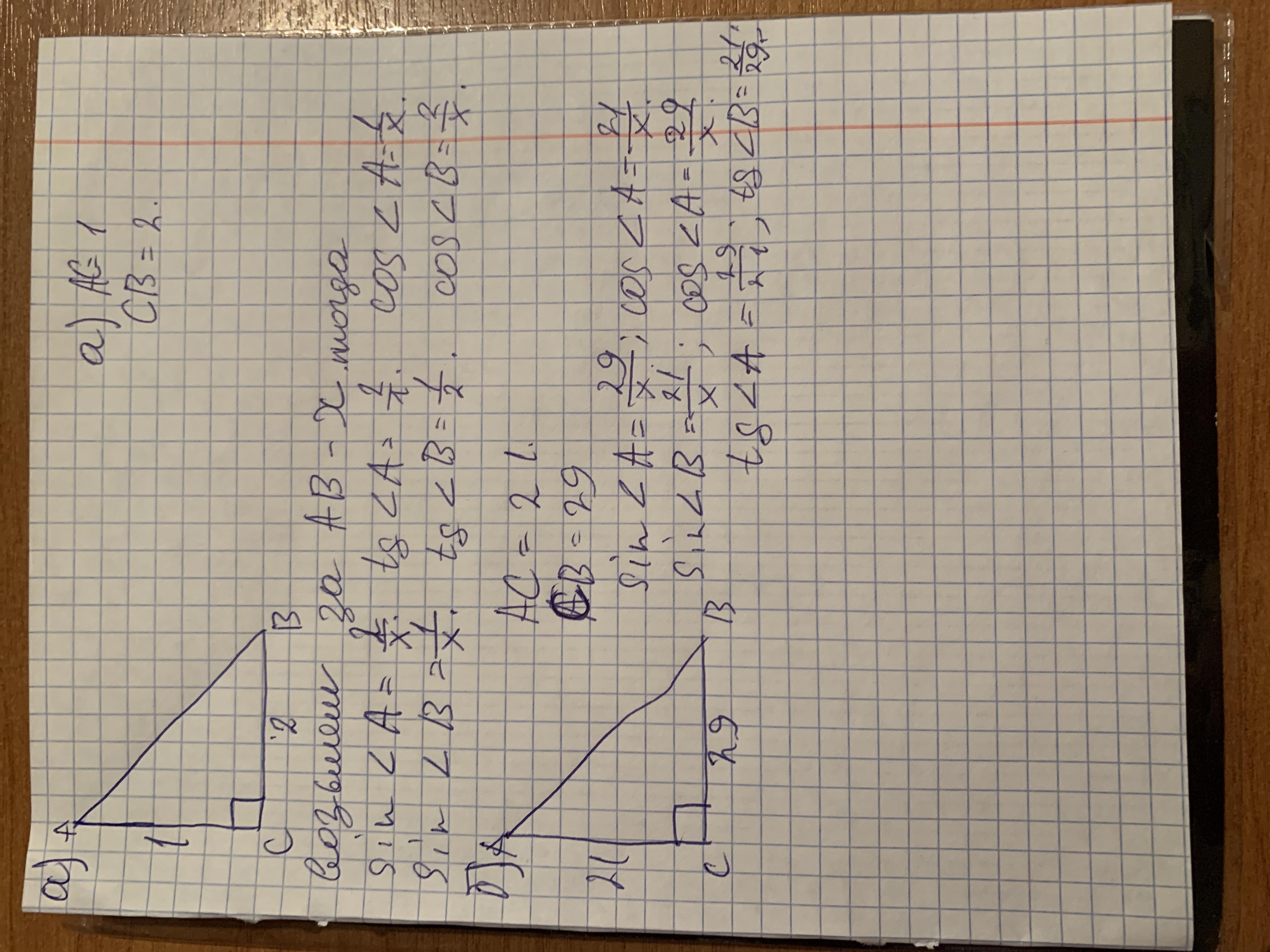 Определите синус,косинус и тангенс острых углов прямоугольного треугольника,если его катеты имеют длины: а) 1 и 2; б) 21 и 29.