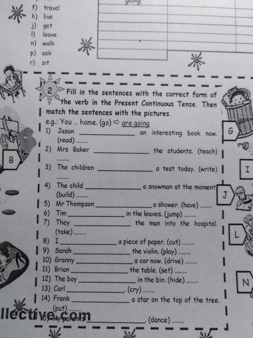пж помогите) fill in the sentenses with the correct form of the verb in the present continuous tense. then match the sentenses with the pictures