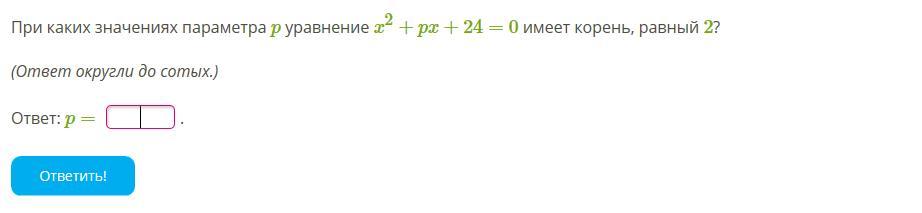 Если уравнение имеет корни, то по теореме ВИета, их произведение равно 24, один корень равен двум, тогда второй 24/2=12, по той же теореме Виета сумма этих корней равна -р, т.е. -р=12+2, откуда р=-14, До сотых 14≈14.00