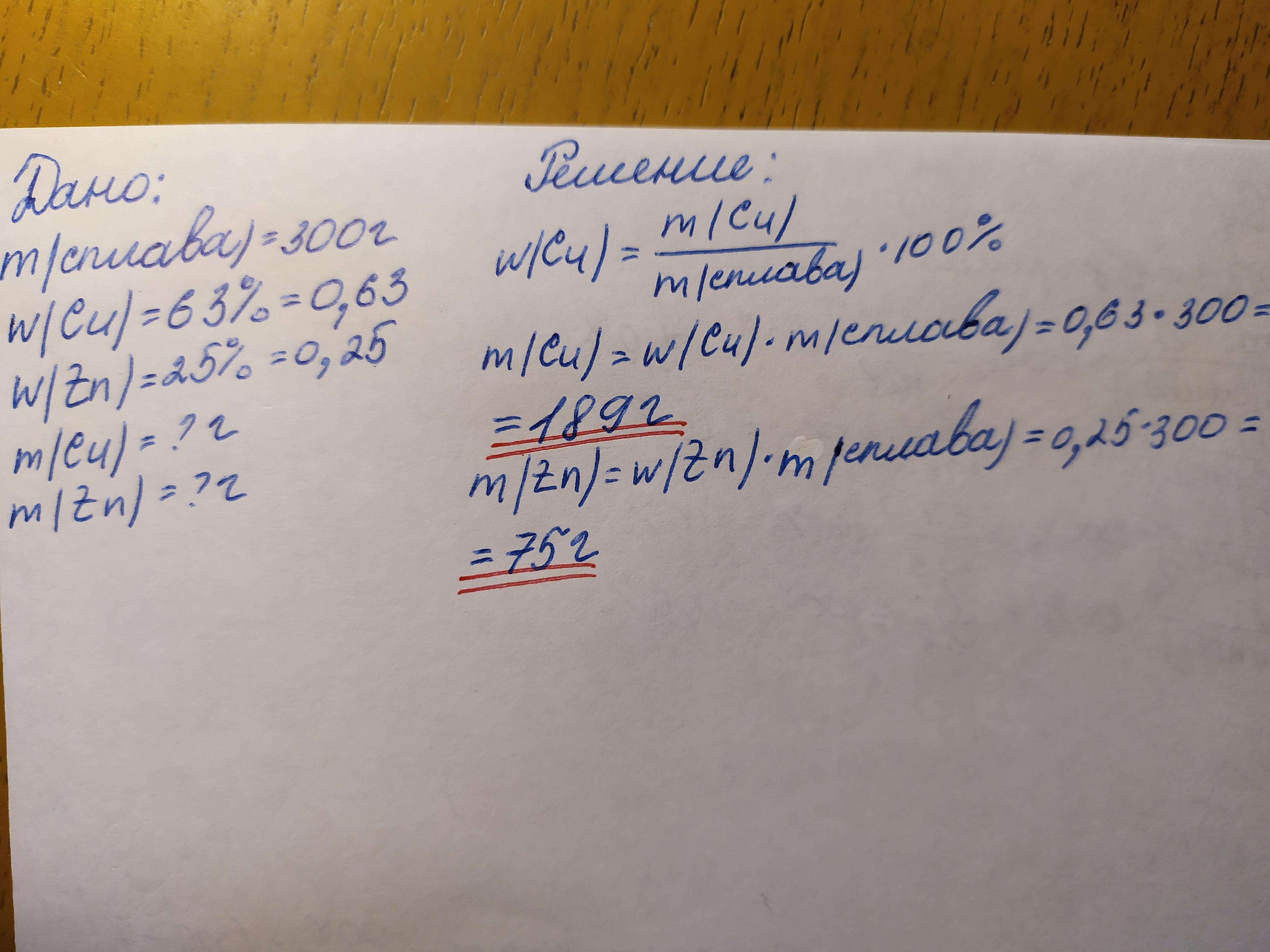 Рассчитайте массы меди и цинка в 300г образца латуни, содержащей 63% меди и 25% цинка.