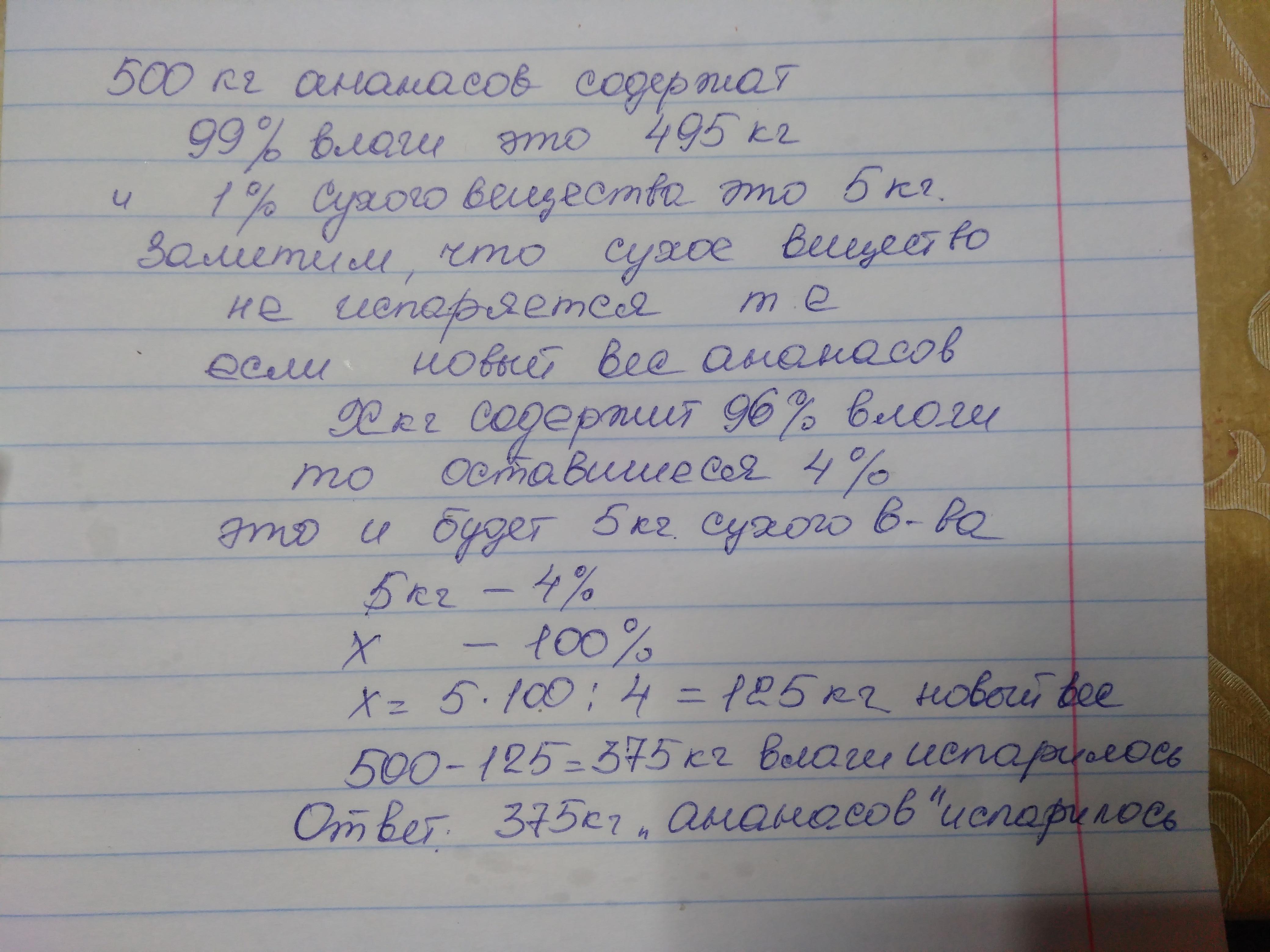 Бизнесмен Иван Петров, окончательно прогорев летом на фейерверках, решил в новом сезоне заняться продажей ананасов и закупил на складе кг ананасов. При покупке ананасы содержали влаги, но за время транспортировки они немного подсохли и теперь содержат воды. Сколько килограммов ананасов "испарилось"?